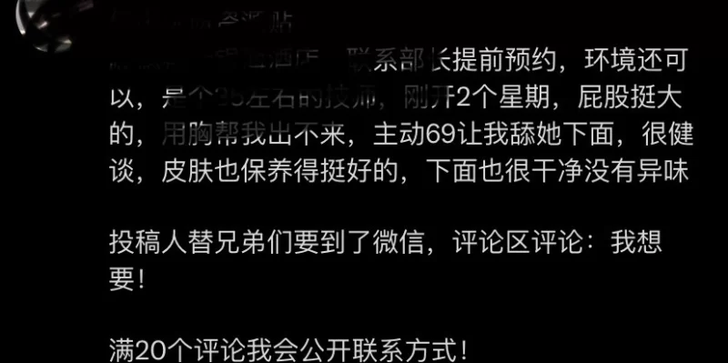 威客管理提示:要求付定金 保证金的,总之提前要钱的都是骗子 最近工作压力比较大,没什么时间放松下,今天下班早,想到之前加了小雪的微信,但是因为各种时间来不及,还没有约过,看圈里发的照片胸好大,很想试下,忍不住约了她。停车位比较难找,她视频帮我带路,来到小区,应该挺安全。门口有保安,说漏带门卡帮你开门。上电梯后,赶紧上楼。开门一看,照片差别不大,还算满意。洗澡后,帮你擦身,来不及冲到床上。一抓胸真的,很难得,然后开始吹,口技还行,差点没忍住。戴t开干,下面还算紧,做了一会忍不住缴枪。总体来说服务还行吧,胸大的可以尝试一下。